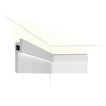 Строгий и современный профиль из серии Steps. Здесь мы разместили самую длинную сторону карниза на потолке, чтобы визуально расширить помещение. Модель имеет срезанный угол сверху и снизу, благодаря чему создается тонкая линия тени. Может использоваться для скрытия светодиодов, а так же как каркас для штор. Разработан дизайнером Орио Тонини.